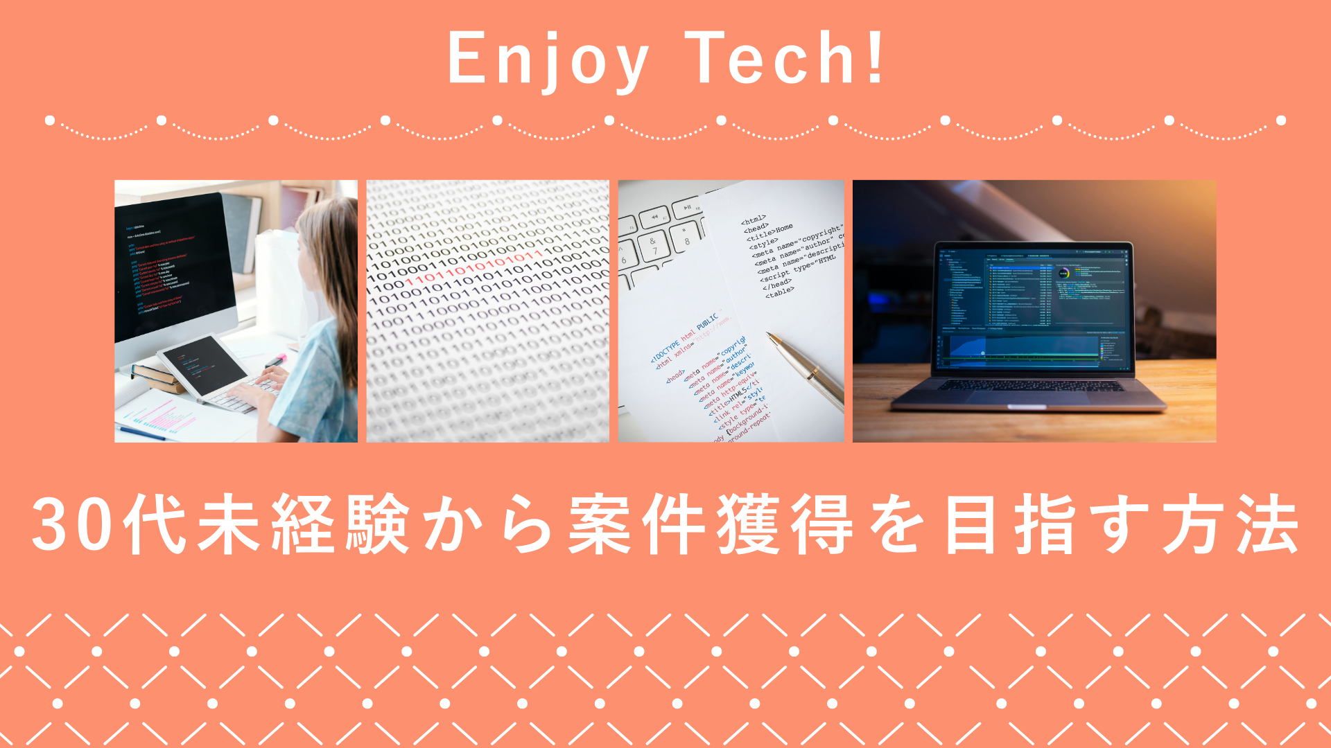 わずか数ヶ月後には、PC一台で報酬を得る「プロ」の仲間入り。Enjoy Tech!で確実な実績を作り、将来の不安を自信に変えましょう。