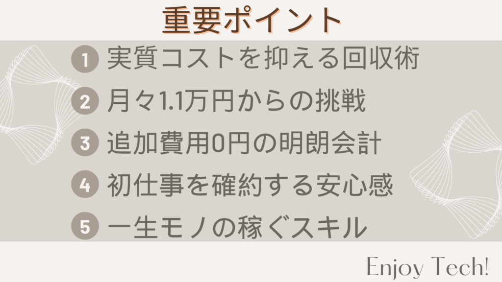 この記事では、Enjoy Tech! 料金の具体的な内訳から、実務案件保証によって受講料を賢く回収する仕組みまで、検討前に知っておくべき情報を整理しました。まずは、この記事でわかる重要ポイントをご覧ください。